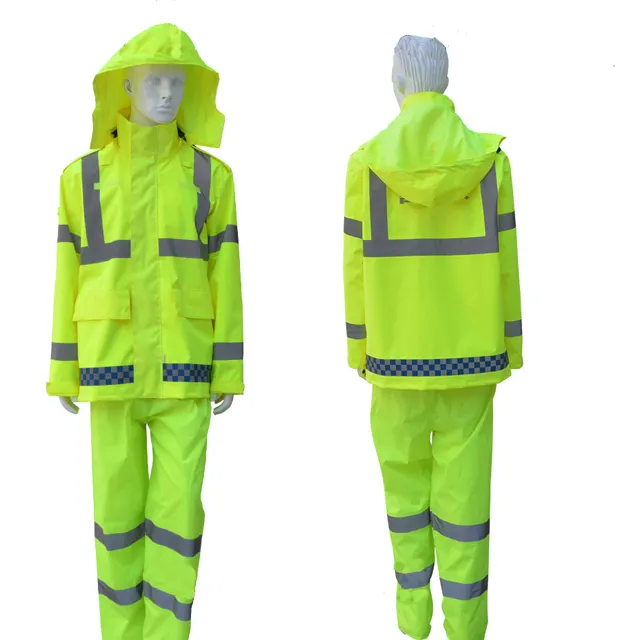 Αδιάβροχη φόρμα με κουκούλα, One Sized, σε κίτρινο φωσφοριζέ χρώμα με ανακλαστικές λωρίδες στο επάνω και κάτω μέρος.