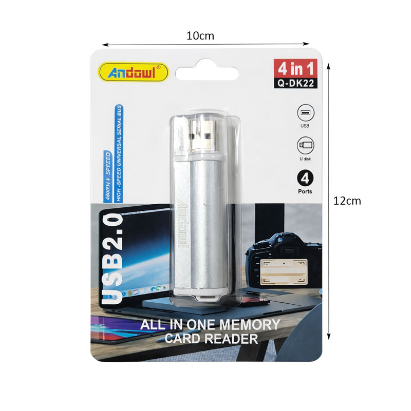 Αναγνώστης καρτών μνήμης USB 2.0 4 σε 1, ιδανικός για γρήγορη και εύκολη μεταφορά δεδομένων από κάρτες μνήμης σε υπολογιστή ή laptop. Υποστηρίζει πολλαπλούς τύπους καρτών και αποτελεί πρακτική λύση για φωτογραφικές μηχανές, action cameras, κινητά και άλλες συσκευές.