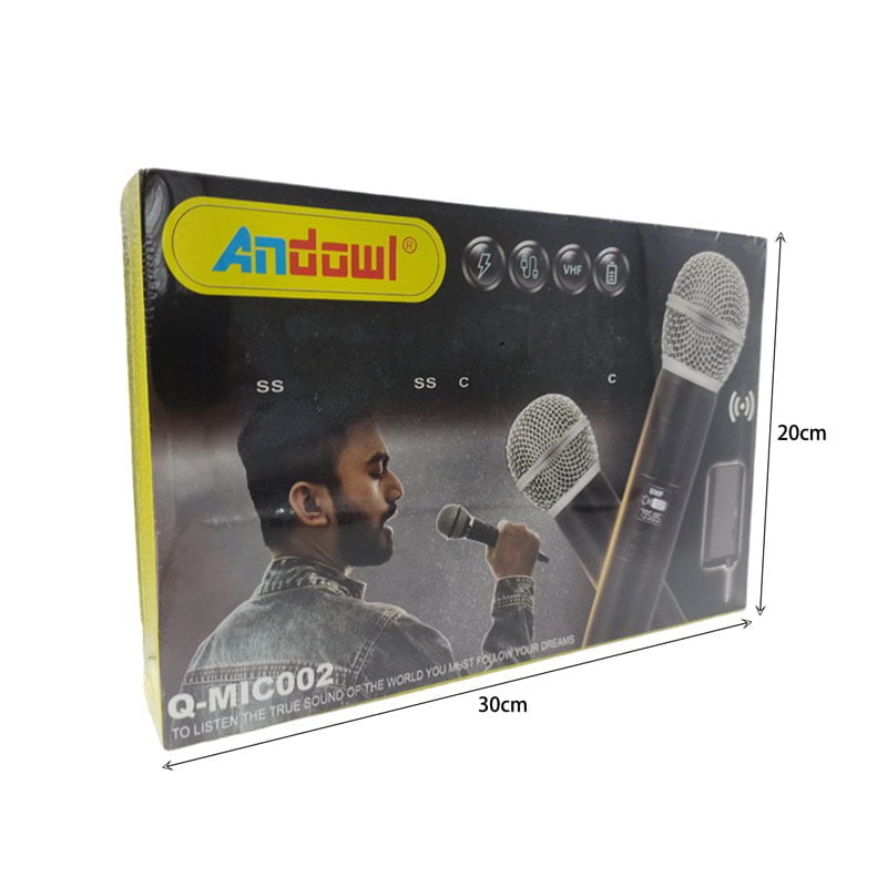 Σετ ασύρματων μικροφώνων χειρός Andowl Q-MIC002 για εξαιρετικής ποιότητας καραόκε. Περιλαμβάνουν δέκτη που λειτουργεί, καλύπτωντας απόσταση έως και 60 μέτρα.