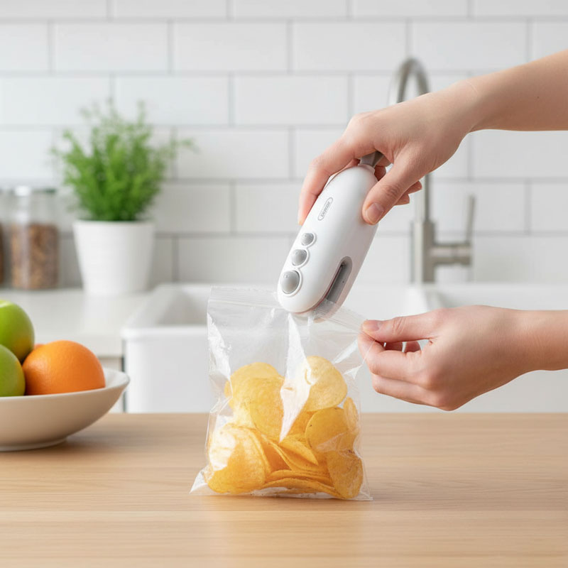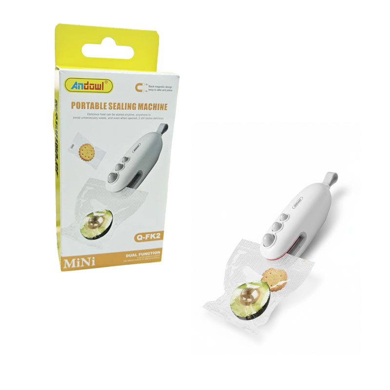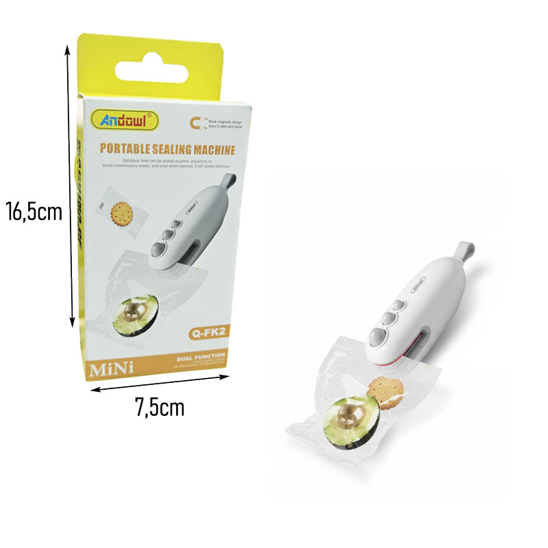 Διατηρήστε τα τρόφιμά σας φρέσκα για περισσότερο με την φορητή συσκευή θερμοκόλλησης σακουλών Andowl Mini Q-FK2. Αυτή η πρακτική συσκευή 2 σε 1 προσφέρει λύση για την άμεση σφράγιση των σακουλών τροφίμων, αποτρέποντας τη σπατάλη και διατηρώντας τη γεύση και τη φρεσκάδα τους. Είναι ιδανική για σνακ, φρούτα, λαχανικά και οτιδήποτε άλλο θέλετε να αποθηκεύσετε σωστά. Ο συμπαγής σχεδιασμός της την καθιστά εύκολη στη χρήση και την αποθήκευση, ενώ η μαγνητική της βάση επιτρέπει να την τοποθετήσετε εύκολα στο ψυγείο σας.