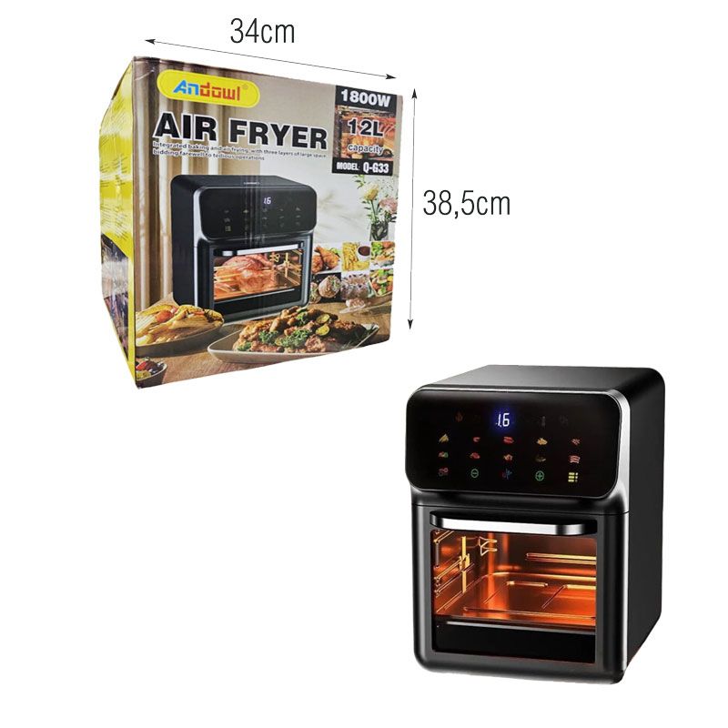 Η φριτέζα αέρος Andowl Q-G33 με ισχύ 1800W και χωρητικότητα 12 λίτρων προσφέρει υγιεινό και γρήγορο μαγείρεμα, χωρίς την ανάγκη υπερβολικού λαδιού. Διαθέτει ευρύχωρο θάλαμο που επιτρέπει την προετοιμασία μεγάλων γευμάτων για όλη την οικογένεια. Με οθόνη αφής και έξυπνες λειτουργίες, μπορείτε να ρυθμίσετε τη θερμοκρασία (80°C–230°C) και τον χρόνο (έως 60 λεπτά) με απόλυτη ακρίβεια.