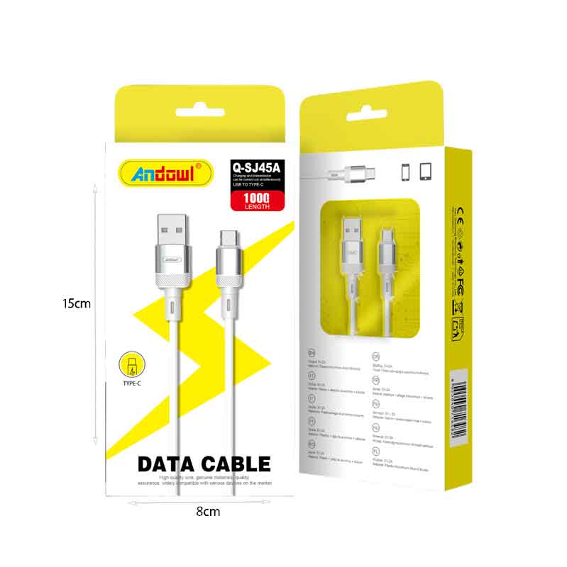 Αξιόπιστο καλώδιο Andowl Q-SJ45A με θύρα USB σε Type-C, κατάλληλο για γρήγορη φόρτιση και σταθερή μεταφορά δεδομένων. Κατασκευασμένο από ανθεκτικά υλικά με μεταλλικές υποδοχές που προσφέρουν αντοχή και μακροχρόνια χρήση. Ιδανικό για κινητά τηλέφωνα, tablets και άλλες συσκευές με θύρα Type-C.