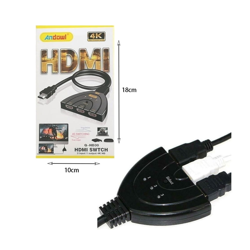 HDMI switch 3 θύρες σε 1. Διαθέτει τρεις εισόδους και μια έξοδο HDMI και μεταφέρει βίντεο υψηλής ευκρίνειας, σε πολλαπλές αναλύσεις μέχρι 4Κ από 3 πηγές σε οθόνη υψηλής ευκρίνειας. Μπορείτε να το χρησιμοποιήσετε με συσκευές αναπαραγωγής όπως HD-DTV και προτζέκτορα. Με κουμπί που σας επιτρέπει να επιλέξετε εναλλαγή μεταξύ των συσκευών HDMI. Άριστη ποιότητα εικόνας και ήχου. Μήκος καλωδίου : 98cm. Μέγεθος : 6.5×8.1.5cm.