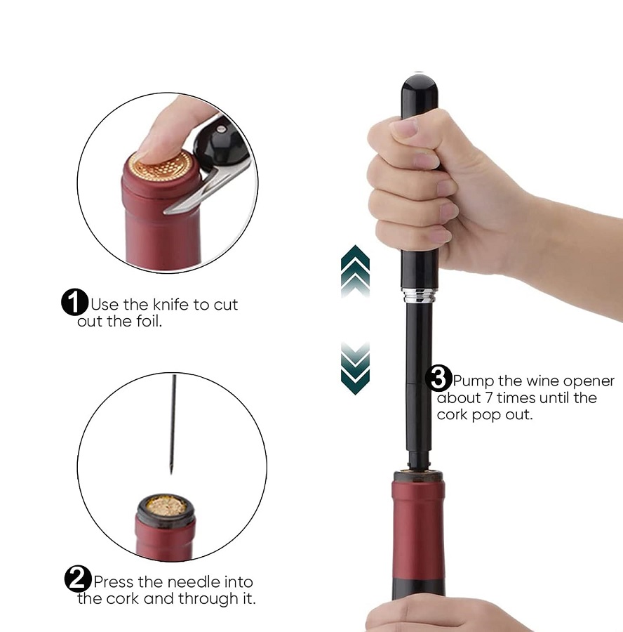 με εργονομικό μηχανισμό πίεσης αέρος που αφαιρεί τον φελλό με ελάχιστες απλές κινήσεις, χωρίς κόπο.