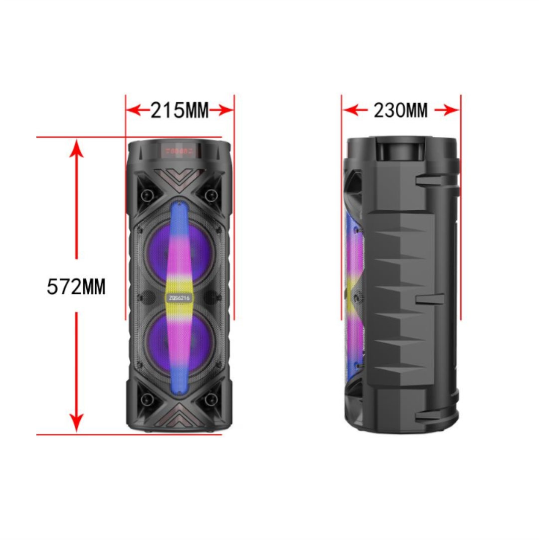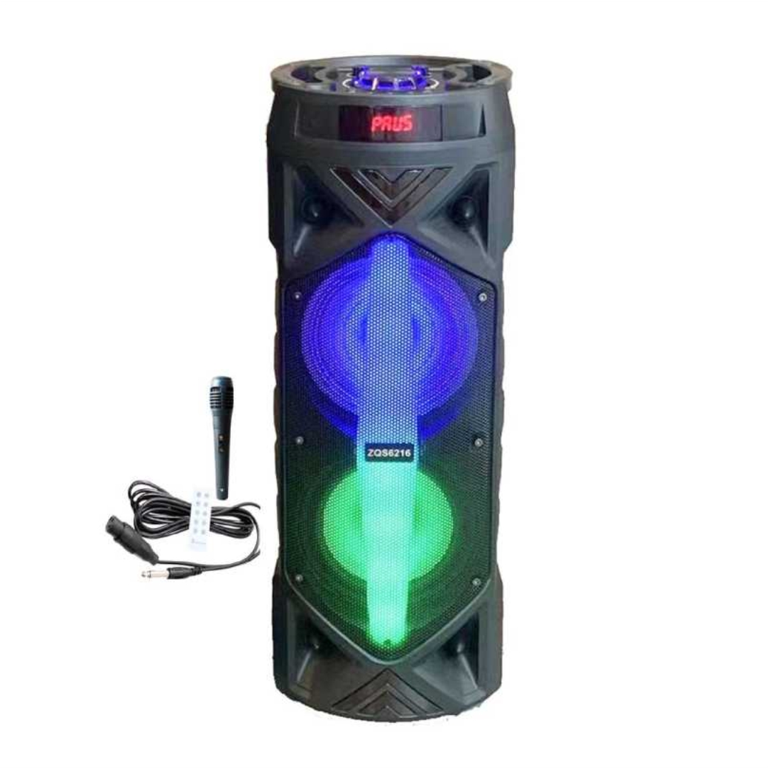 Επαναφορτιζόμενο ηχείο Bluetooth ZQS6216. Συνδέεται με κινητά, laptop, tablet και PC. Διαθέτει θύρα USB, AUX  και TF card. Περιλαμβάνει καλώδιο USB. Έχει την δυνατότητα φόρτισης μέσω usb. Διαστάσεις 58×21.5x23cm. Περιέχει μικρόφωνο και χειριστήριο. Speaker 6.5" x 2. Ισχύς 30W. Συχνότητες 45Hz-18KHz. Μπαταρία 4500mAh. Τάση 5V. Βάρος 3.8kg.
