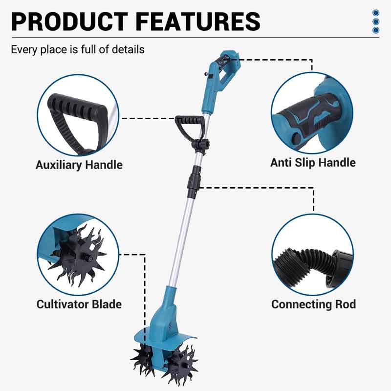 Η συσκευή λειτουργεί με δύο μπαταρίες, εξασφαλίζοντας μεγαλύτερη αυτονομία και ευελιξία στις εργασίες χωρίς καλώδια. Η περιστρεφόμενη κεφαλή διευκολύνει την επεξεργασία του εδάφους, ενώ το χαμηλό βάρος επιτρέπει παρατεταμένη χρήση χωρίς κόπωση.