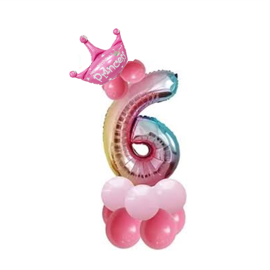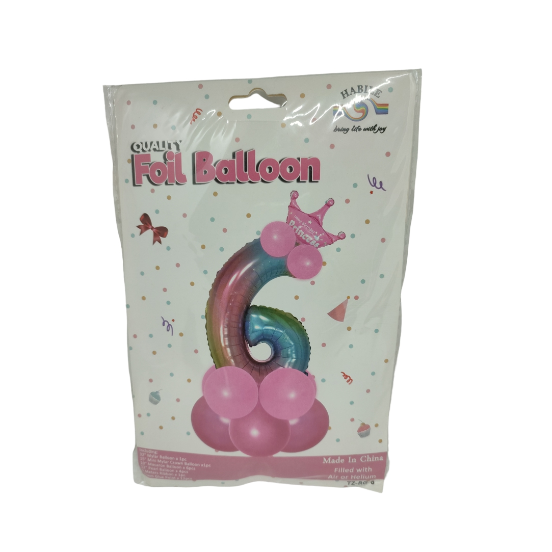 Συσκευασία μπαλονιών με τον αριθμό 6. Περιλαμβάνει τον αριθμό 32", την κορόνα 15" και μπαλόνια. Kατάλληλα για τη διακόσμηση του χώρου σας ή κάποιας εκδήλωσης. Τα μπαλόνια αποστέλλονται ξεφούσκωτα. Συνιστάται να μην φουσκώσουν με περισσότερα λίτρα αέρα ή ήλιο από αυτά που ενδείκνυνται από τον κατασκευαστή καθώς υπάρχει κίνδυνος να σκάσουν.