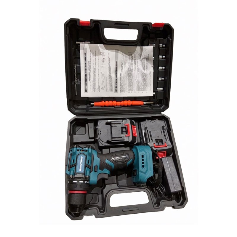 Σετ που περιλαμβάνει μπαταρίες, φορτιστή και διάφορα εξαρτήματα (τρυπάνια, καρυδάκια) μέσα σε πλαστική θήκη μεταφοράς.