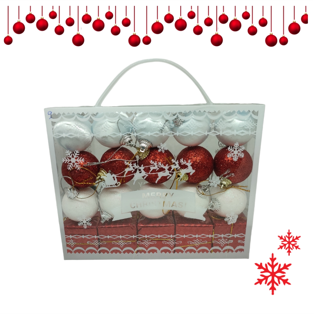 Σετ Χριστουγεννιάτικα στολίδια. Ιδανικά για να στολίστε το δέντρο σας και να δώσετε στο χώρο μια γιορτινή ατμόσφαιρα. Σε λευκό και κόκκινο χρώμα με γκλίτερ. Διάμετρος 3,5cm. Συσκευασία 20 τεμαχίων. Περιλαμβάνει μπάλες και στολίδια σε σχήμα δώρου.