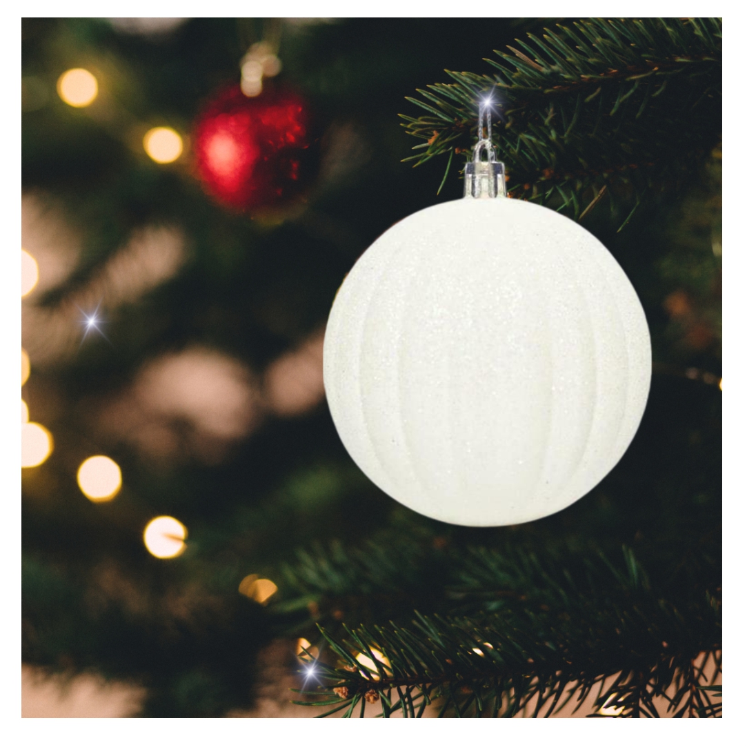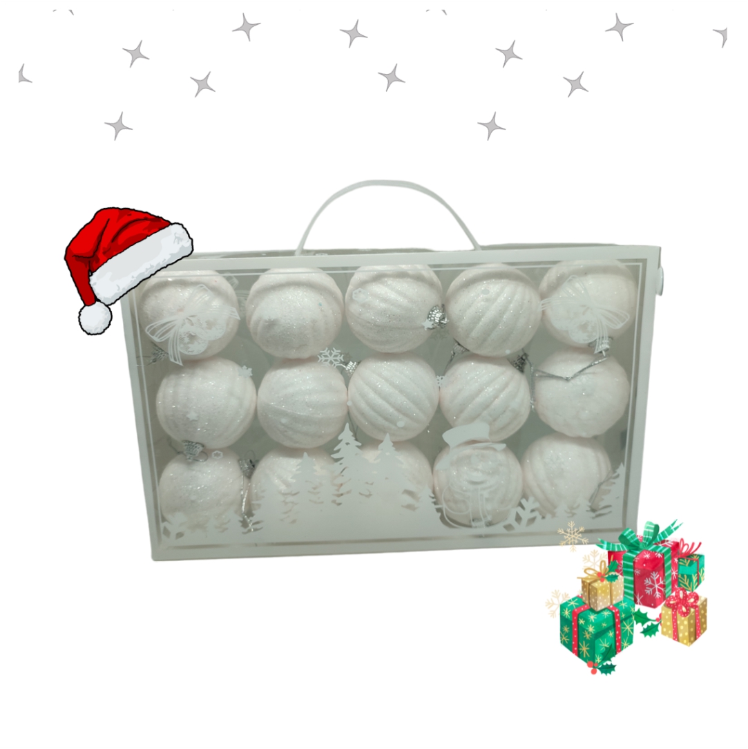 Σετ Χριστουγεννιάτικες μπάλες. Ιδανικές για να στολίστε το δέντρο σας και να δώσετε στο χώρο μια γιορτινή ατμόσφαιρα. Σε άσπρο χρώμα με γκλίτερ. Διάμετρος 5,5cm. Συσκευασία 15 τεμαχίων.