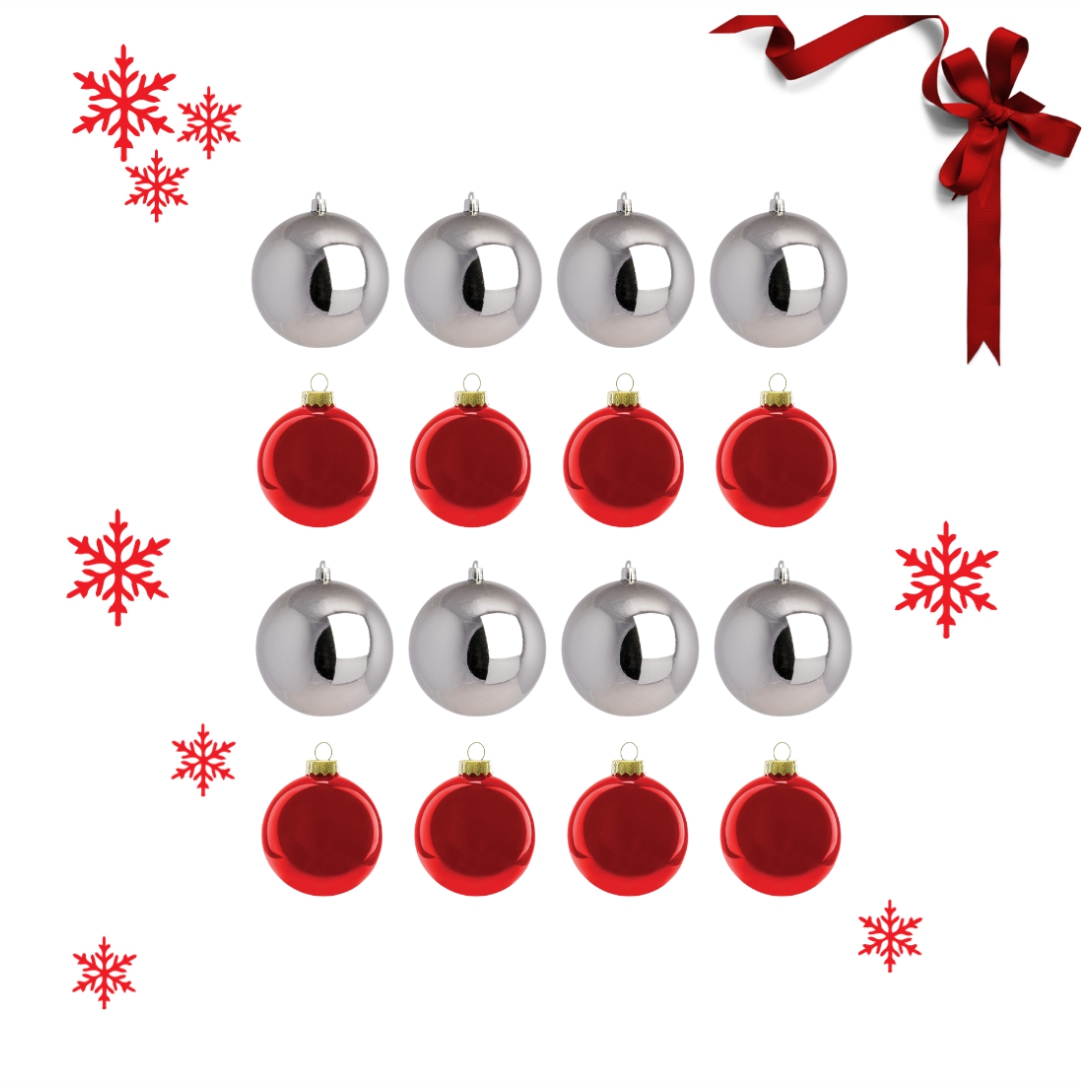 Σετ Χριστουγεννιάτικες μπάλες γυαλιστερές. Ιδανικές για να στολίστε το δέντρο σας και να δώσετε στο χώρο μια γιορτινή ατμόσφαιρα. Σε κόκκινο και ασημί χρώμα. Διάμετρος 4,5cm. Συσκευασία 16τεμαχίων.