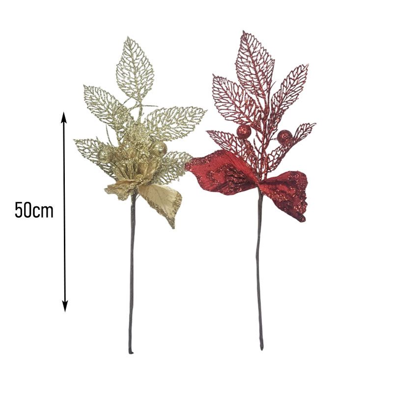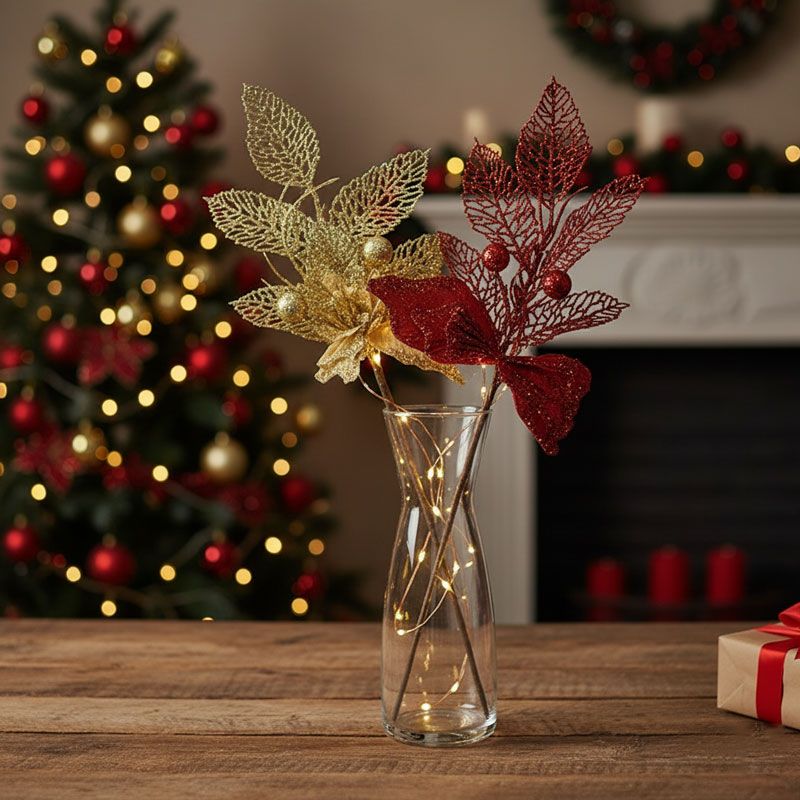 Διαθέσιμα σε δύο κλασικές αποχρώσεις, χρυσό και κόκκινο, διαθέτουν φύλλα με λεπτομερή σχέδια και έντονη λάμψη γκλίτερ που αντανακλά το φως, δημιουργώντας μια ατμόσφαιρα πολυτέλειας. Κάθε κλαδί περιλαμβάνει επίσης διακοσμητικά στοιχεία όπως μούρα ή φιόγκους, προσθέτοντας μια επιπλέον πινελιά κομψότητας.