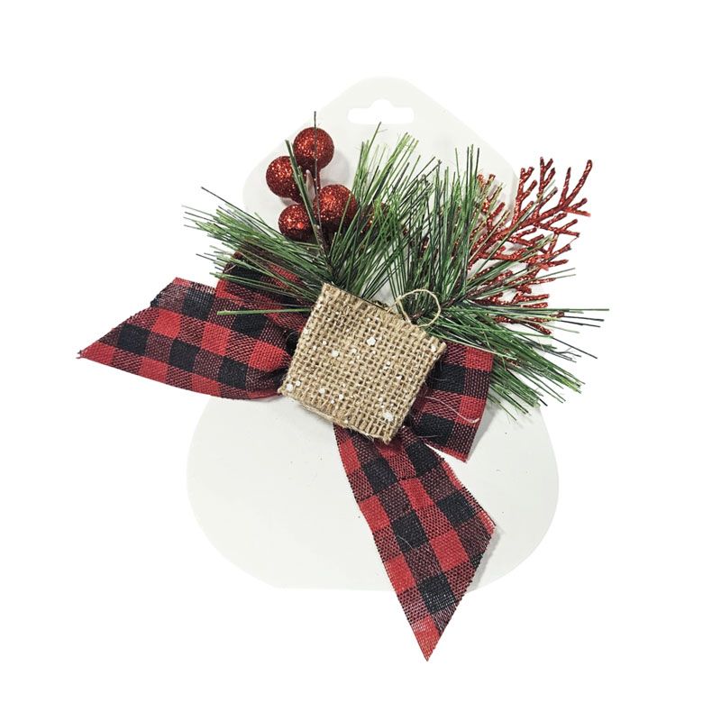 Χριστουγεννιάτικο διακοσμητικό κλαδί με κόκκινα μπαλάκια, φυσικό πράσινο φύλλωμα και καρό φιόγκο με λινάτσα. Ιδανικό για στολισμό δέντρου, στεφανιών, δώρων ή διακοσμητικών συνθέσεων. Συνδυάζει παραδοσιακά χρώματα και φυσική υφή, προσθέτοντας μια ζεστή και γιορτινή ατμόσφαιρα στον χώρο.