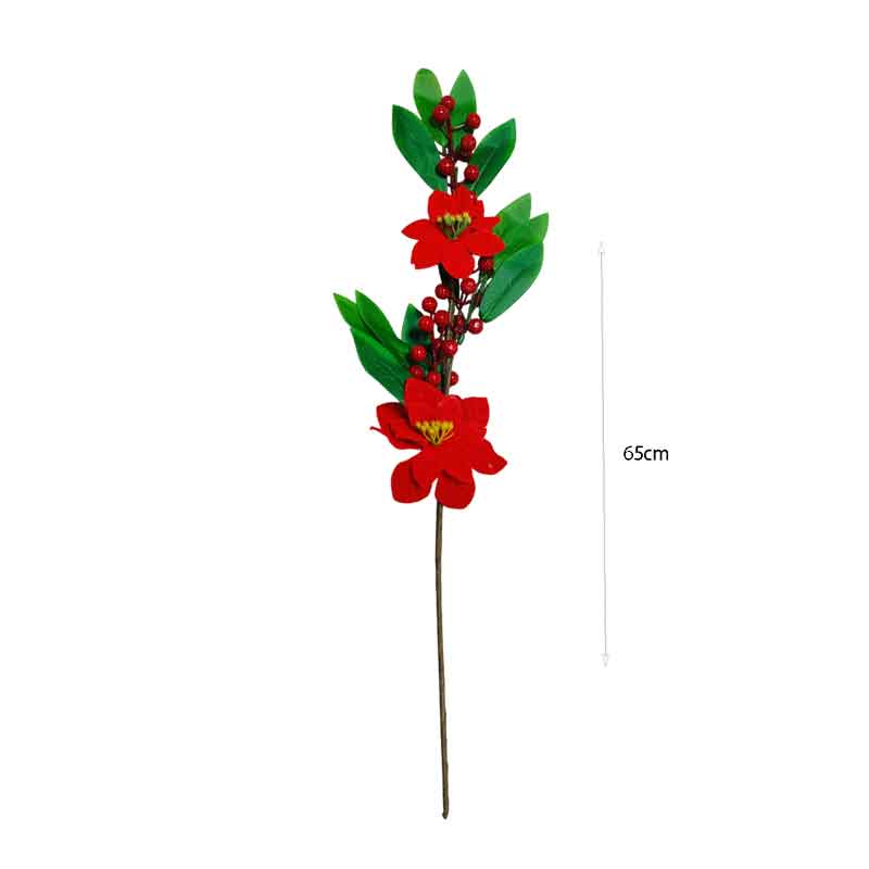 Διακοσμητικό χριστουγεννιάτικο κλαδί με κόκκινα λουλούδια, πράσινα φύλλα και κόκκινους καρπούς, ύψους 65cm. Ιδανικό για στολισμό δέντρου, βάζου ή γιορτινών συνθέσεων, προσθέτοντας φυσική και λαμπερή χριστουγεννιάτικη ατμόσφαιρα.