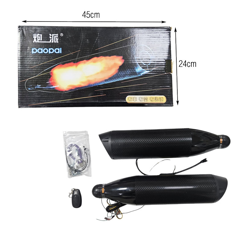 Διακοσμητικό τελικό εξάτμισης με εντυπωσιακό εφέ φλόγας, ιδανικό για αναβάθμιση της εμφάνισης μοτοσυκλέτας ή οχήματος σε εκθέσεις, events ή διακοσμητική χρήση. Διαθέτει ανθρακί φινίρισμα που προσδίδει σπορ και μοντέρνο χαρακτήρα, ενώ το εφέ φλόγας ενεργοποιείται εύκολα μέσω τηλεχειριστηρίου.