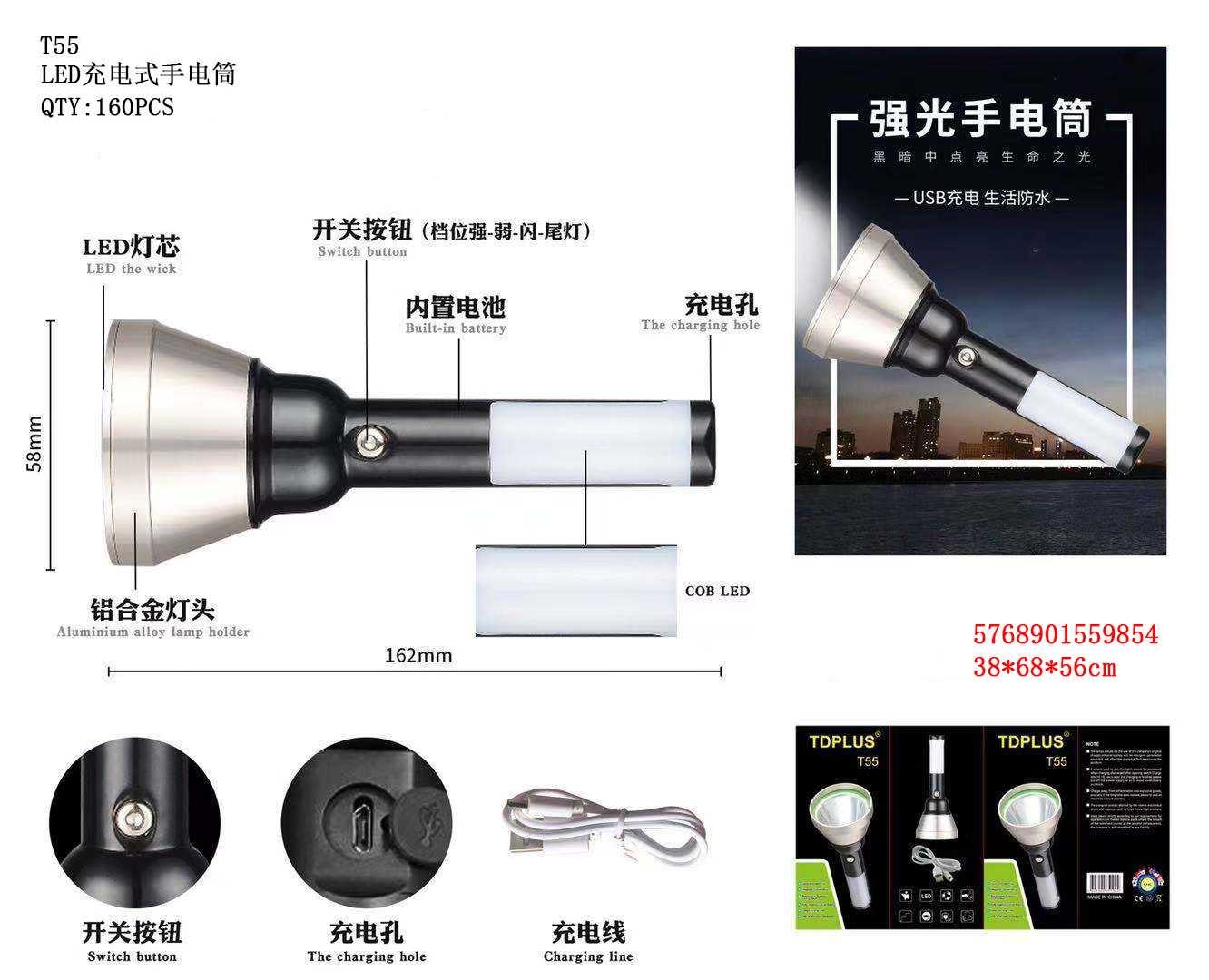 Επαναφορτιζόμενος φακός LED με πλαϊνό φως, μικρός και πρακτικός για μεταφορά παντού.