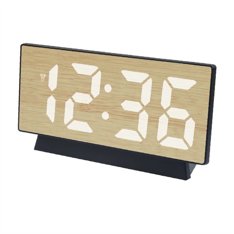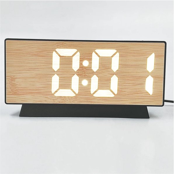 Ξύλινο επιτραπέζιο ρολόι με ξυπνητήρι. Σχεδιασμένο για κάθε σύγχρονο σπίτι. Με κομψό και λιτό design μπορεί να ταιριάξει εύκολα στο υπνοδωμάτιο ή το καθιστικό και να δημιουργήσει μια ευχάριστη ατμόσφαιρα στο χώρο. Ένα μοναδικού σχεδιασμού ρολόι που θα σας εντυπωσιάσει με το μοναδικό ξύλινο σχεδιασμό του και τις λειτουργίες του. Σβηστό, φαίνεται σαν ένα απλό κομμάτι ξύλο και όταν ανάψει, εμφανίζονται μόνο τα ηλεκτρονικά ψηφία. Με λευκό led.