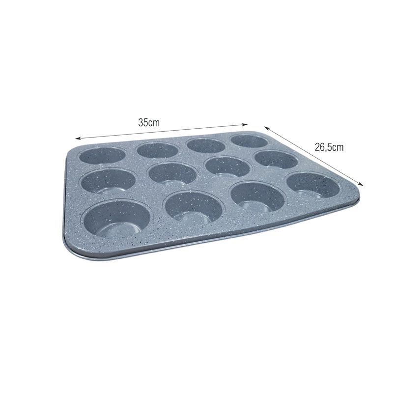 Φόρμα ψησίματος με μαρμάρινη αντικολλητική επίστρωση, ιδανική για την παρασκευή muffins, cupcakes και άλλων μικρών γλυκών. Η υψηλής ποιότητας αντικολλητική επιφάνεια εξασφαλίζει εύκολη αφαίρεση των γλυκών χωρίς να κολλάνε και απλό καθάρισμα μετά τη χρήση.