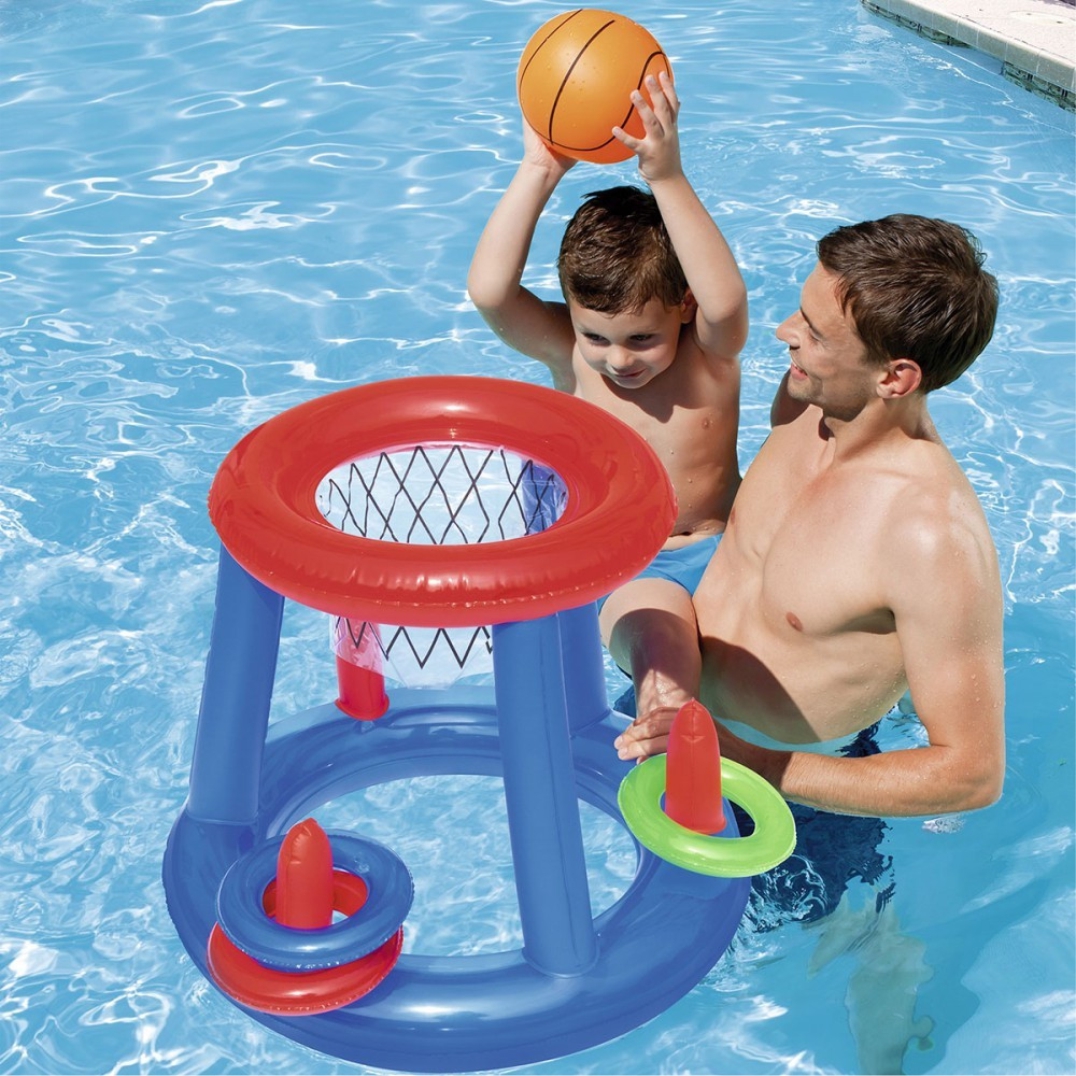 Φουσκωτή μπασκέτα πισίνας και θαλάσσης. Ιδανική για να διασκεδάσετε όλοι μαζί στις διακοπές σας. Περιλαμβάνει μία μπάλα και τρεις δακτυλίους. Κατάλληλο για ηλικία άνω των 3 ετών. Είναι σε πράσινο και κίτρινο χρώμα με πορτοκαλί μπάλα.