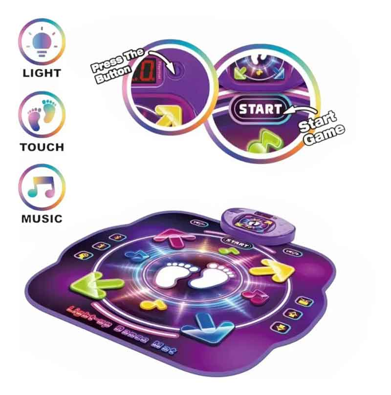 Το ηλεκτρονικό χαλάκι χορού είναι ένα διαδραστικό παιχνίδι που συνδυάζει κίνηση, μουσική και διασκέδαση. Διαθέτει φωτιζόμενα πλήκτρα και ενσωματωμένους ήχους, καθοδηγώντας τα παιδιά να πατήσουν τα σωστά σημεία ακολουθώντας τον ρυθμό.