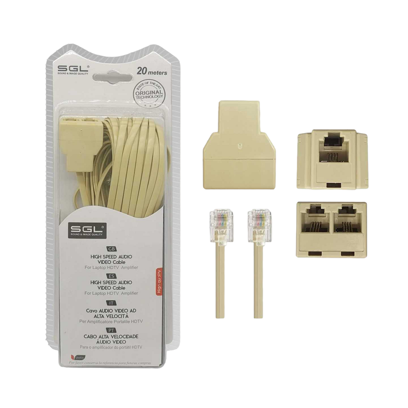 Καλώδιο γραμμής τηλεφώνου πλακέ, 6P4C1-2 με διακλαδωτή 2 εξόδων. Μήκος: 20m.
