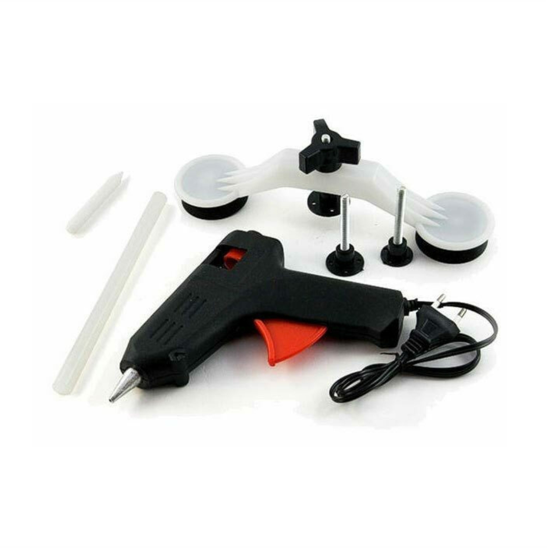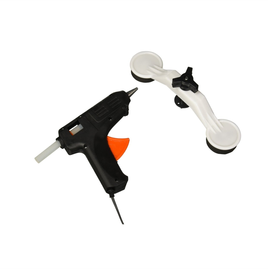 Kit επιδιόρθωσης βαθουλωμάτων αυτοκινήτου. Περιλαμβάνει θερμική κόλλα στεγανοποίησης, θερμικό πιστόλι, μοχλό Pops-a-Den με βεντούζες.