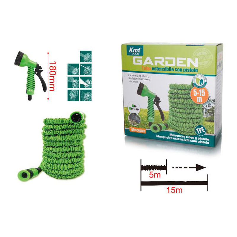 Επεκτεινόμενο Λάστιχο Ποτίσματος 5-15 Μέτρα Με Πιστόλι Kmt Tools είναι ο πιο συχνά χρησιμοποιούμενος εξοπλισμός κήπου , ο οποίος δεν είναι μόνο χρήσιμος στον κήπο , αλλά και σε άλλες δραστηριότητες , όπως πλύσιμο αυτοκινήτων, πλύσιμο χαλιών , καθαρισμός αποχετεύσεων κ.λπ.
