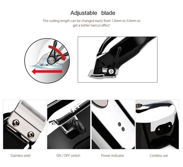 Επαναφορτιζόμενη κουρευτική μηχανή με λεπίδα ακριβείας από ανοξείδωτο ατσάλι και εντυπωσιακό design. Με μεγάλη αυτονομία μπαταρίας, εργονομικό σχεδιασμό και αξεσουάρ, κατάλληλη για κάθε είδους περιποίηση σε μαλλιά, γένια και σώμα. Κατάλληλη και για επαγγελματική χρήση.