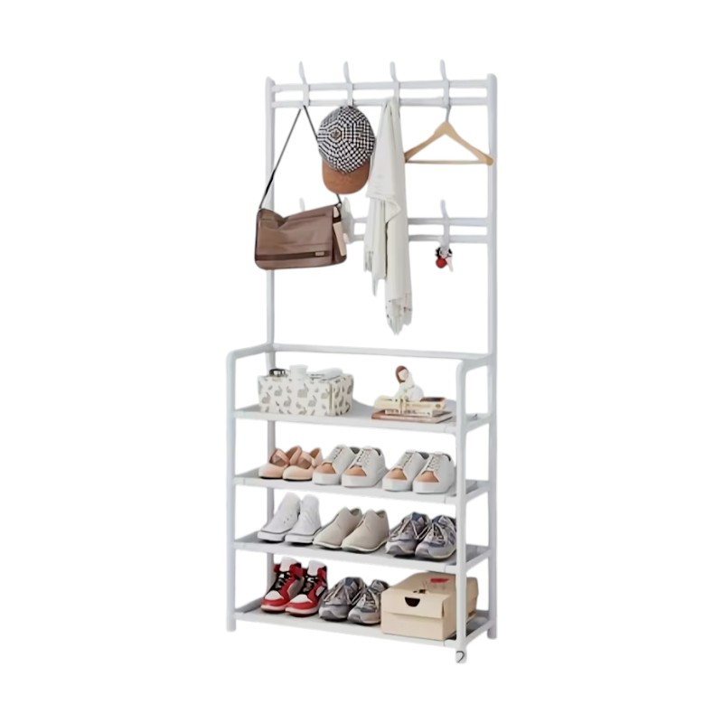 Κρεμάστρα δαπέδου μεταλλική, με 4 υφασμάτινα ράφια παπουτσιών, ιδανική ως έπιπλο εισόδου ή για την οργάνωση των ρούχων στο δωμάτιό σας . Διαστάσεις: 154 x 60 x 26 cm.