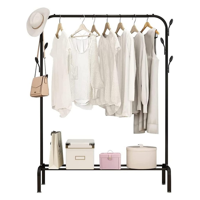 Kρεμάστρα δαπέδου μονή, μεταλλική, με ράφι παπουτσιών και πλαϊνές κρεμάστρες, ιδανική ως έπιπλο εισόδου ή για την οργάνωση των ρούχων στο δωμάτιό σας.