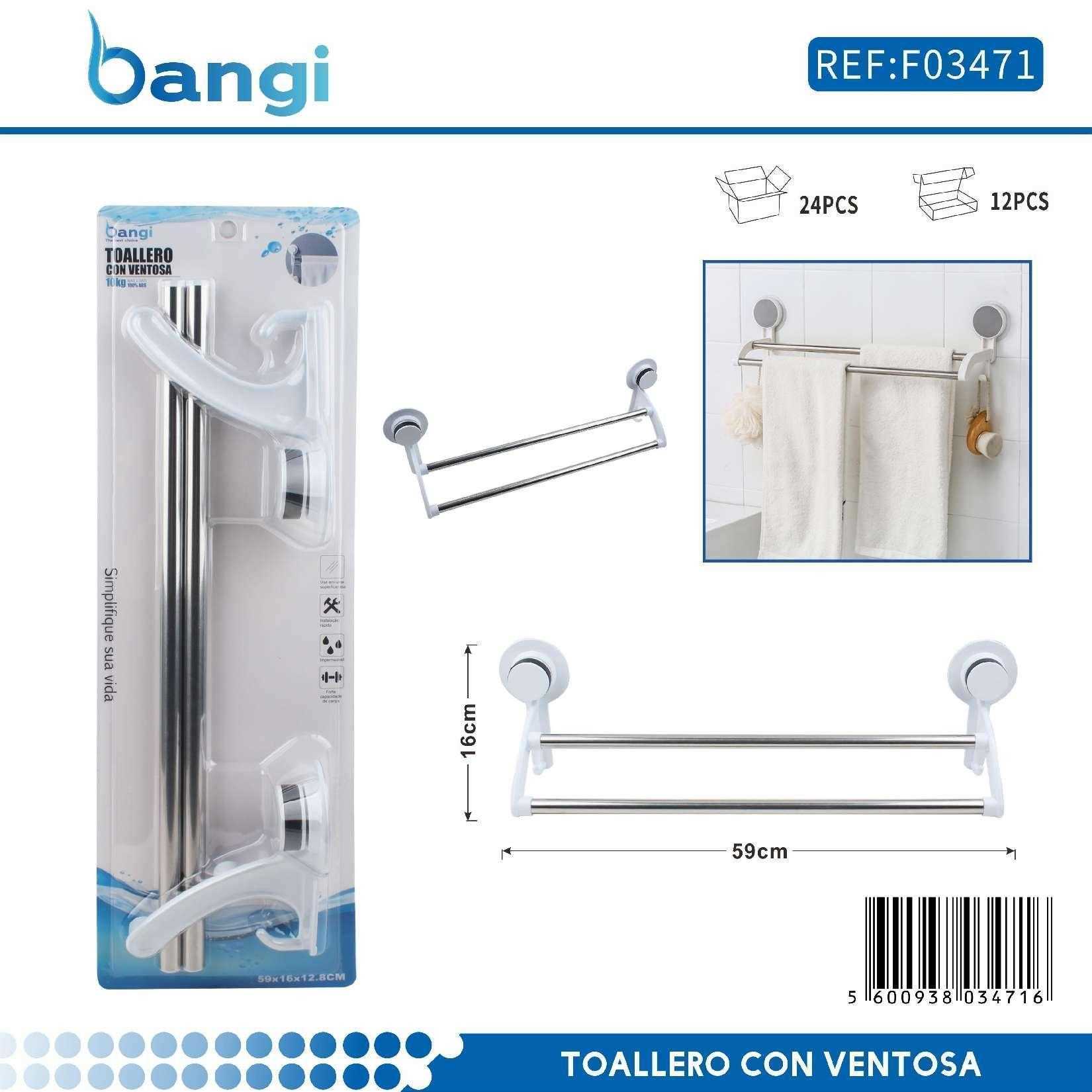 Κρεμάστρα πετσέτας μπάνιου με μεταλλική ράγα inox και πλαστικές βάσεις υψηλής ανθεκτικότητας. Εύκολη τοποθέτηση με ισχυρές βεντούζες, χωρίς να απαιτείται βίδωμα.