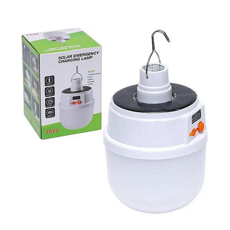 Κρεμαστό ηλιακό φωτιστικό σε λευκό χρώμα, που συγκεντρώνει και αποθηκεύει ηλιακή ενέργεια για τη λειτουργία του, ώστε να μη χρειάζεται να συνδεθεί σε παροχή ρεύματος.