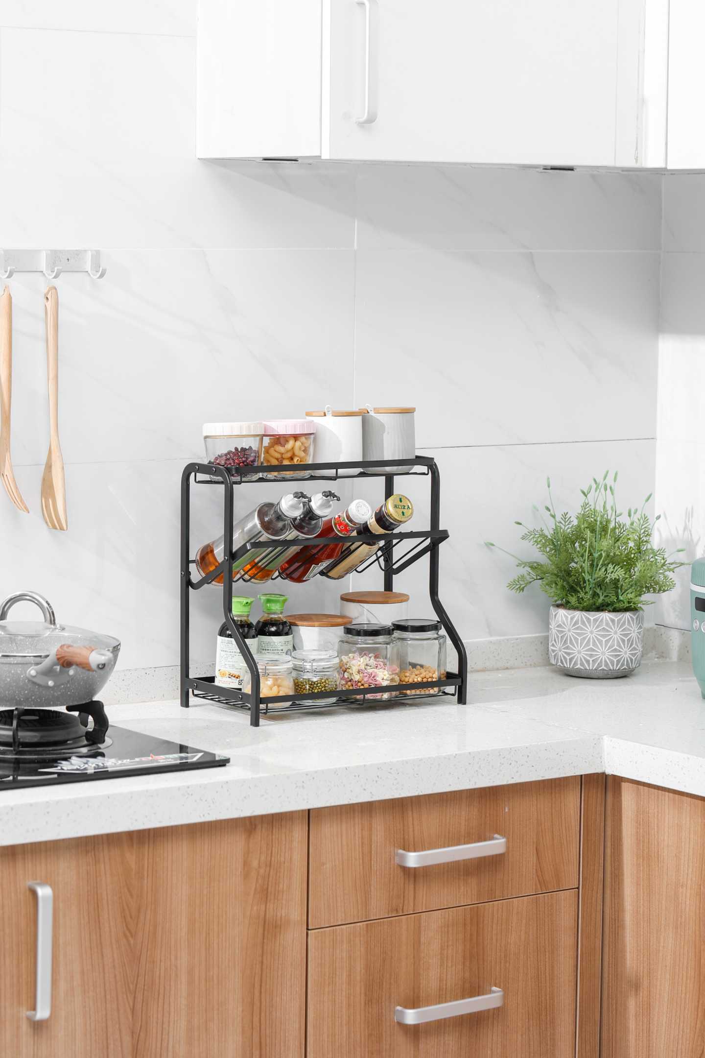 Μεταλλική ραφιέρα τροφίμων κουζίνας, με 3 πρακτικά ράφια κατάλληλα για γυάλινα δοχεία και μπουκάλια.