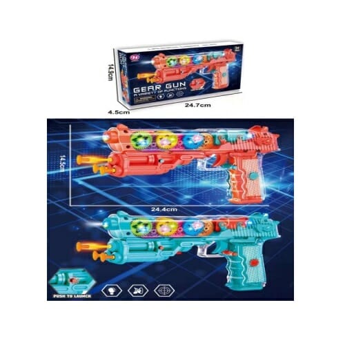 Παιδικό ηλεκτρονικό όπλο που εκτοξεύει βεντούζες, με ήχο και φωτισμό LED, σε διαφανή σχεδίαση.
