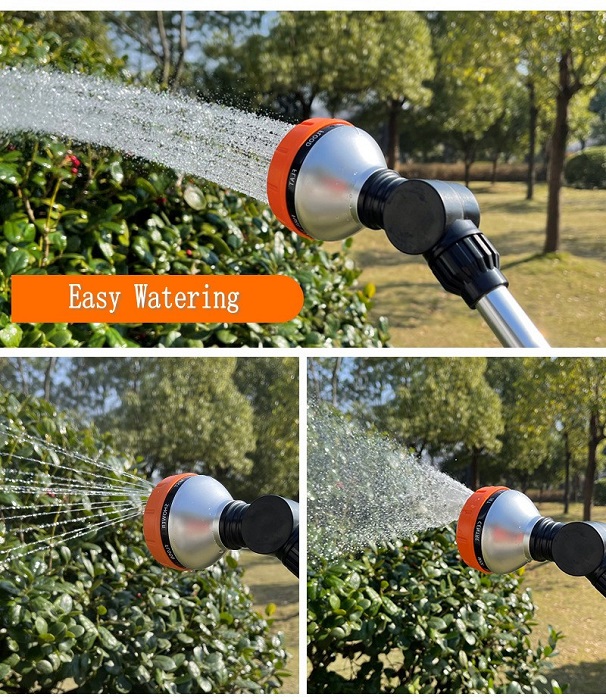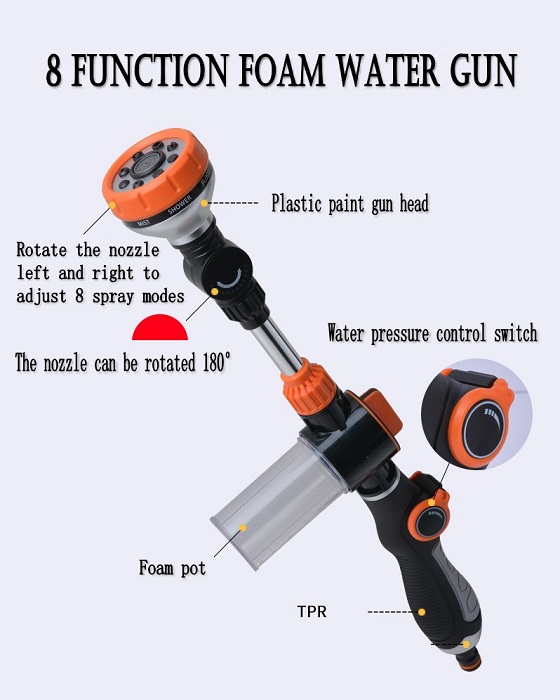 Πιστόλι ποτίσματος για λάστιχο με ενσωματωμένο δοχείο σαπουνιού 100ml. Διαθέτει εργονομική λαβή, 8 διαφορετικές ρυθμίσεις ψεκασμού, ρυθμιζόμενη πίεση και κεφαλή με ρυθμιζόμενη κλίση. Διαστάσεις: 47x15cm. Απόσταση ψεκασμού: έως 10m.