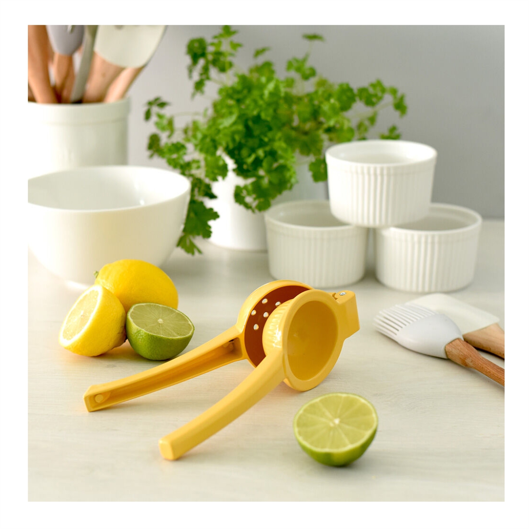 Πρέσα χειρός λεμονιού. Κατασκευασμένος από πλαστικό. Ιδανικός για να στύβετε το λεμόνι χωρίς να χρειάζεται να λερώσετε τα χέρια σας. Μήκος 19 εκατοστά.