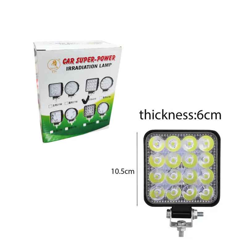 Τετράγωνος προβολέας εργασίας με 16 LED, ισχύος 48W, ιδανικός για αυτοκίνητα, φορτηγά, τρακτέρ, σκάφη και μηχανήματα. Προσφέρει ισχυρό λευκό φως για καθαρή ορατότητα σε συνθήκες χαμηλού φωτισμού. Κατασκευή υψηλής αντοχής με στεγανότητα για προστασία από σκόνη και νερό.