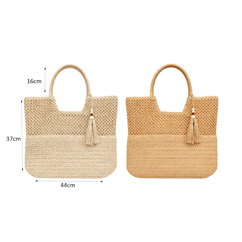 Κομψή πλεκτή τσάντα θαλάσσης σε δύο φυσικές αποχρώσεις, ιδανική για καλοκαιρινές εμφανίσεις με στυλ. Ο ιδιαίτερος σχεδιασμός της συνδυάζει διαφορετικές υφές πλέξης και διακοσμητική φούντα που προσθέτει μια boho αισθητική.