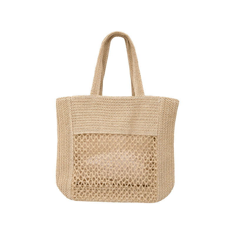 Στυλάτη πλεκτή τσάντα θαλάσσης σε φυσική μπεζ απόχρωση, ιδανική για καλοκαιρινές εμφανίσεις και καθημερινή χρήση. Διαθέτει ενσωματωμένη διχτυωτή εξωτερική τσέπη που προσφέρει επιπλέον πρακτικότητα για εύκολη πρόσβαση σε μικροαντικείμενα.