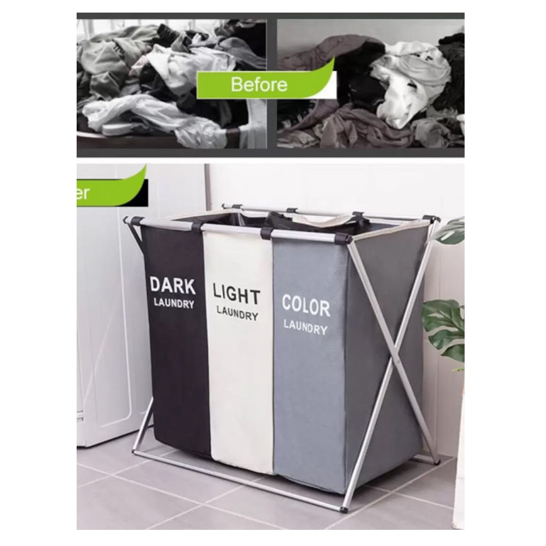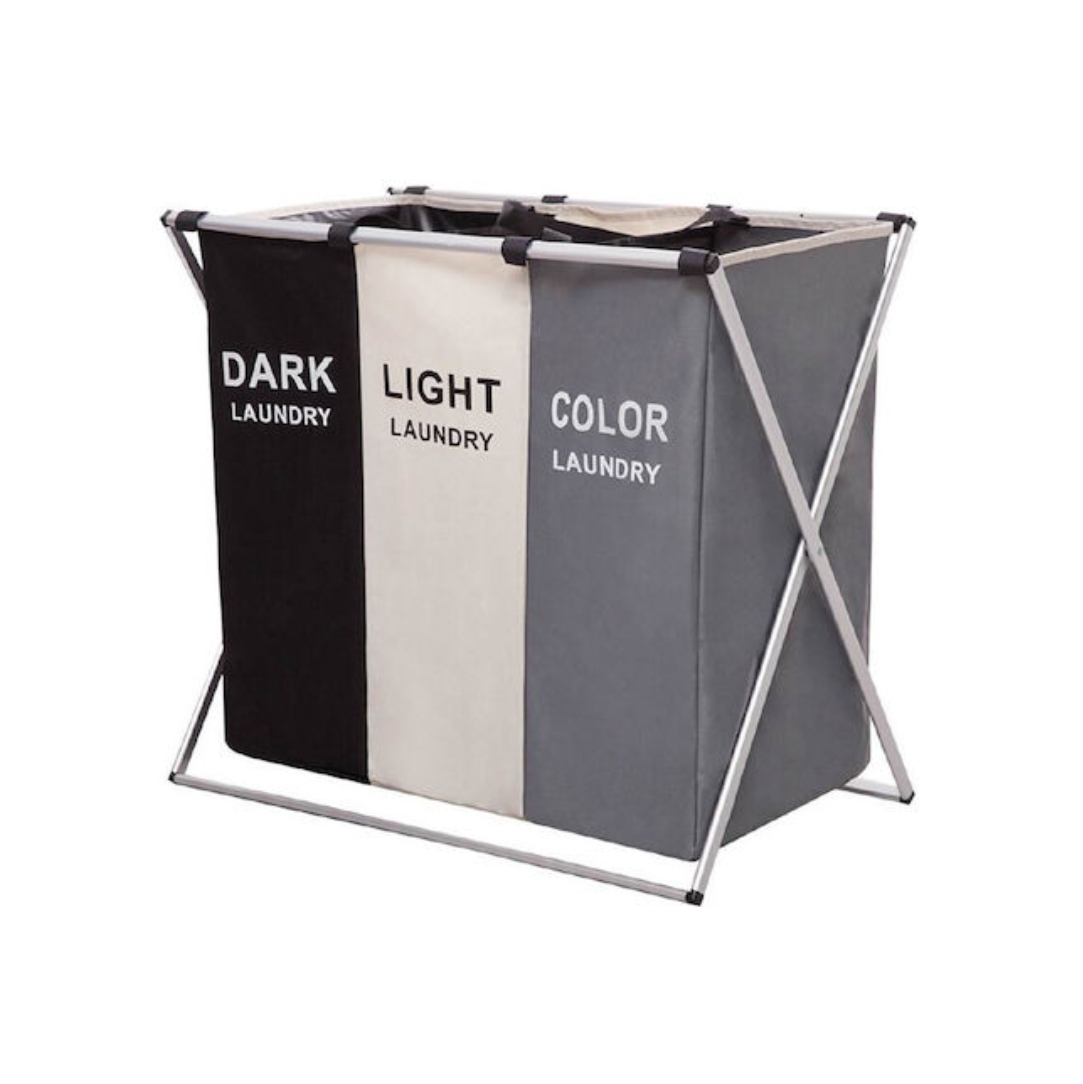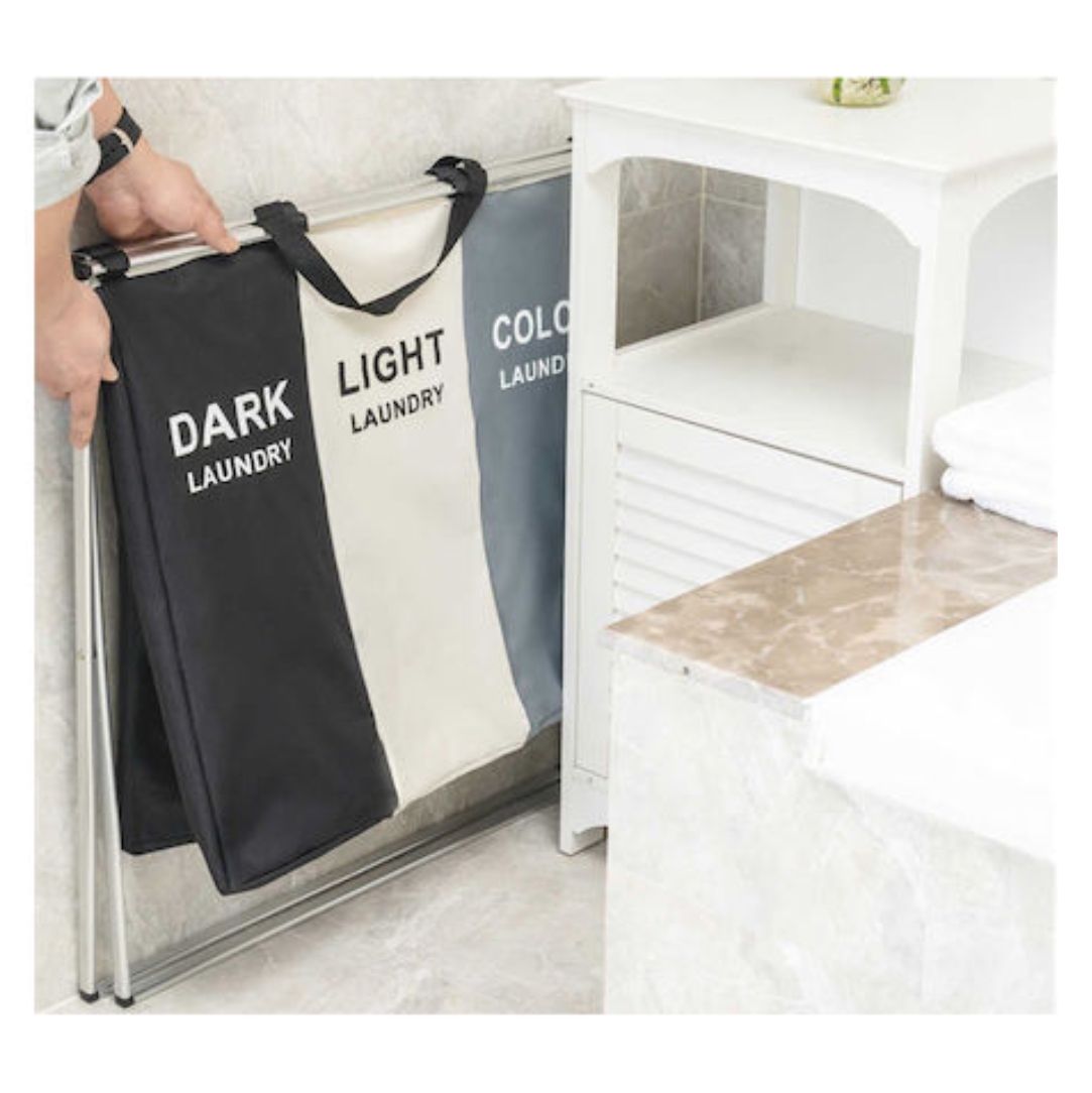 Πτυσσόμενο καλάθι απλύτων με 3 σάκους. Μπορείτε να χωρίζετε εύκολα τα λευκά, τα σκούρα ή τα χρωματιστά ρούχα. Είναι κατασκευασμένο από ανθεκτικό ύφασμα, στιβαρό και ελαφρύ πλαίσιο που το καθιστά εύκολο στην μεταφορά.