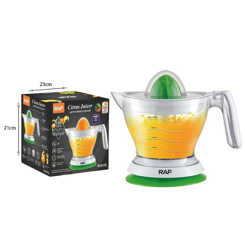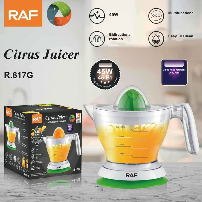 Ηλεκτρικός στίφτης, της εταιρείας Raf, με ισχύ 40 Watt. Διαθέτει έναν κώνο κανονικού μεγέθους κατάλληλο για πορτοκάλια, ώστε να απολαμβάνετε καθημερινά φρέσκους χυμούς, πλούσιους σε βιταμίνες. Το φίλτρο που συμπεριλαμβάνεται θα ξεχωρίσει τον χυμό από τον πολτό και τα κουκούτσια, δίνοντας σας το βέλτιστο αποτέλεσμα και την καλύτερη γεύση.
