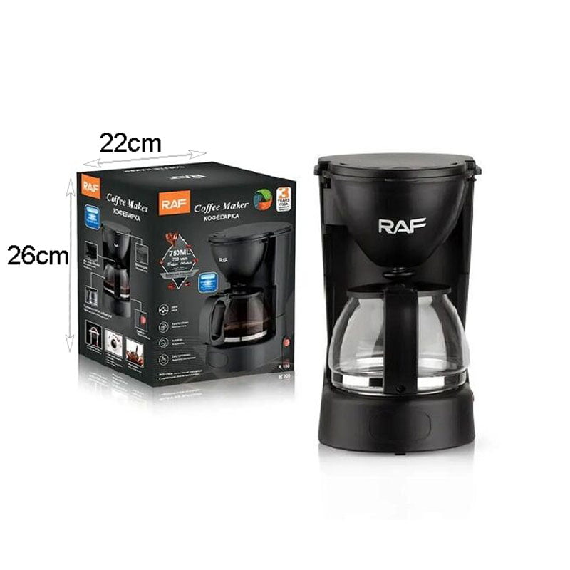 Η καφετιέρα φίλτρου, της εταιρείας Raf, δέχεται αλεσμένο καφέ σε σκόνη. Αυτό την καθιστά εύκολη και γρήγορη στη χρήση, αφού εσείς απλά προσθέτετε καφέ στο φίλτρο και στη συνέχεια πατάτε το κουμπί εκκίνησης ώστε να ξεκινήσει η εκχύλιση. Το δοχείο νερού έχει χωρητικότητα 750 ml και μπορεί να παράξει έως και 6 κούπες καφέ.