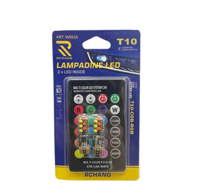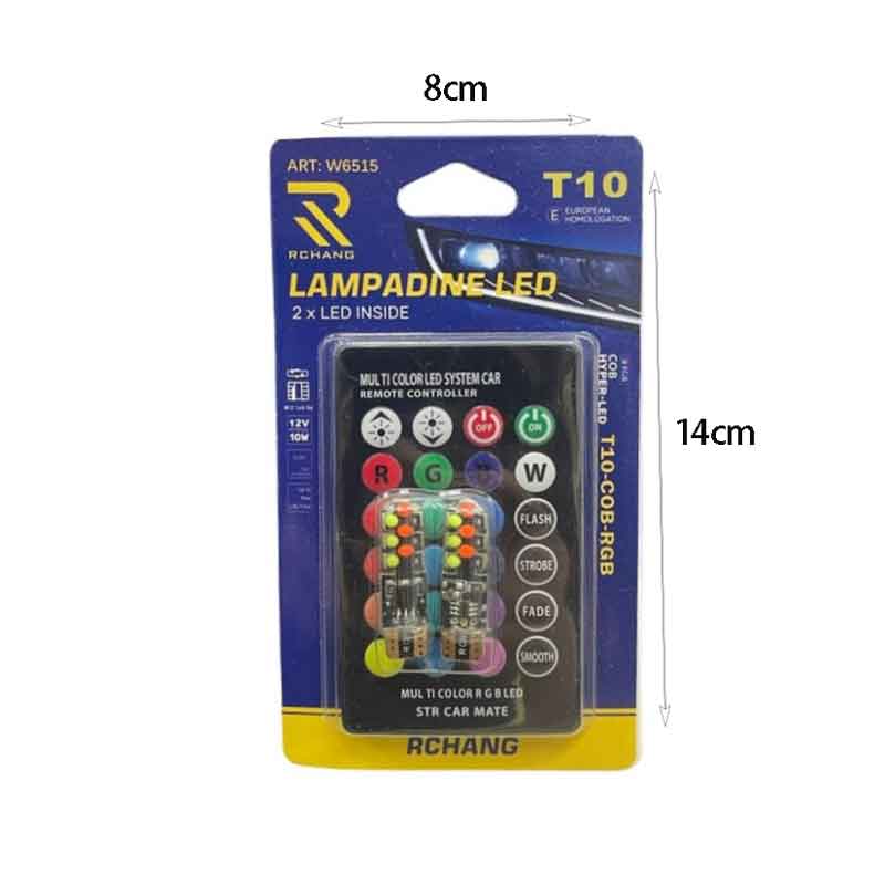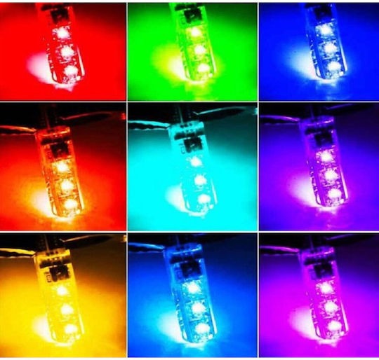 Λάμπες Αυτοκινήτου LED T10 με τηλεχειριστήριο RGB 12V 10W. Αυτές οι λάμπες προσφέρουν μοναδική ατμόσφαιρα στο εσωτερικό ή το εξωτερικό του αυτοκινήτου με δυνατότητα επιλογής ανάμεσα σε 15 χρώματα και 4 δυναμικά εφέ φωτισμού. Το πρακτικό τηλεχειριστήριο διευκολύνει την επιλογή των ρυθμίσεων φωτισμού.