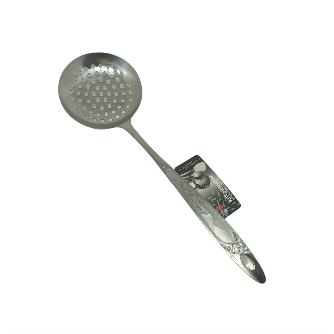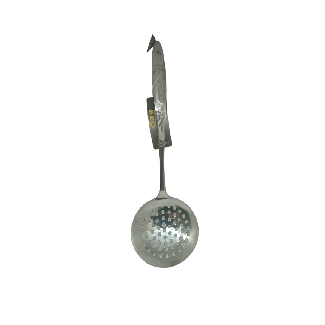 Ρηχή κουτάλα ξαφρίσματος τρυπητή από ανοξείδωτο ατσάλι. Ιδανική για την κουζίνα. Διαστάσεις 33,5×10,5cm.