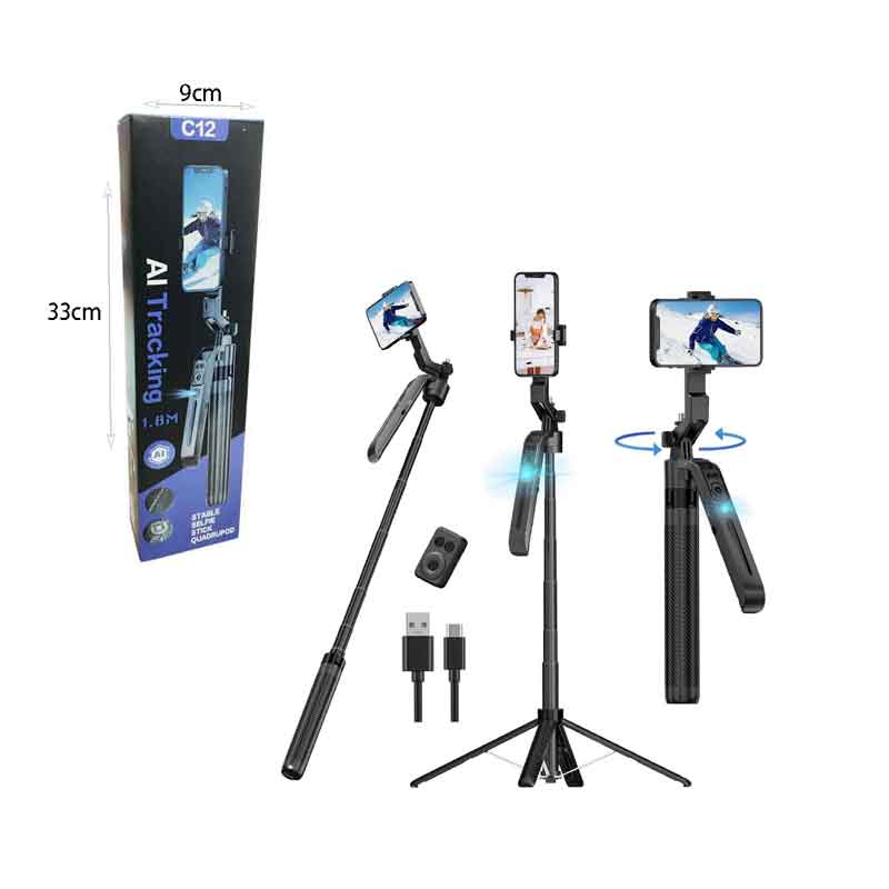 Πολυλειτουργικό selfie stick τρίποδο C12 με τεχνολογία AI Tracking, σχεδιασμένο για σταθερές και επαγγελματικές λήψεις χωρίς την ανάγκη εφαρμογής. Υποστηρίζει αυτόματη παρακολούθηση προσώπου, διατηρώντας το θέμα πάντα στο κέντρο του κάδρου, ιδανικό για βίντεο, live streaming, φωτογραφίες και δημιουργία περιεχομένου.