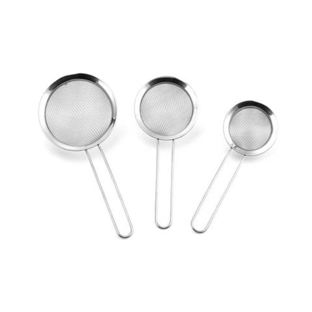 Σετ σουρωτήρι inox. Ιδανικό για αποτελεσματικό φιλτράρισμα τσαγιού. Κατάλληλο για να κοσκινίζετε. Σετ 3 τεμαχίων, σε 3 διαφορετικά μεγέθη. Διαστάσεις μεγάλο 23×11,5cm, μεσαίο 22x10cm, μικρό 20x8cm.