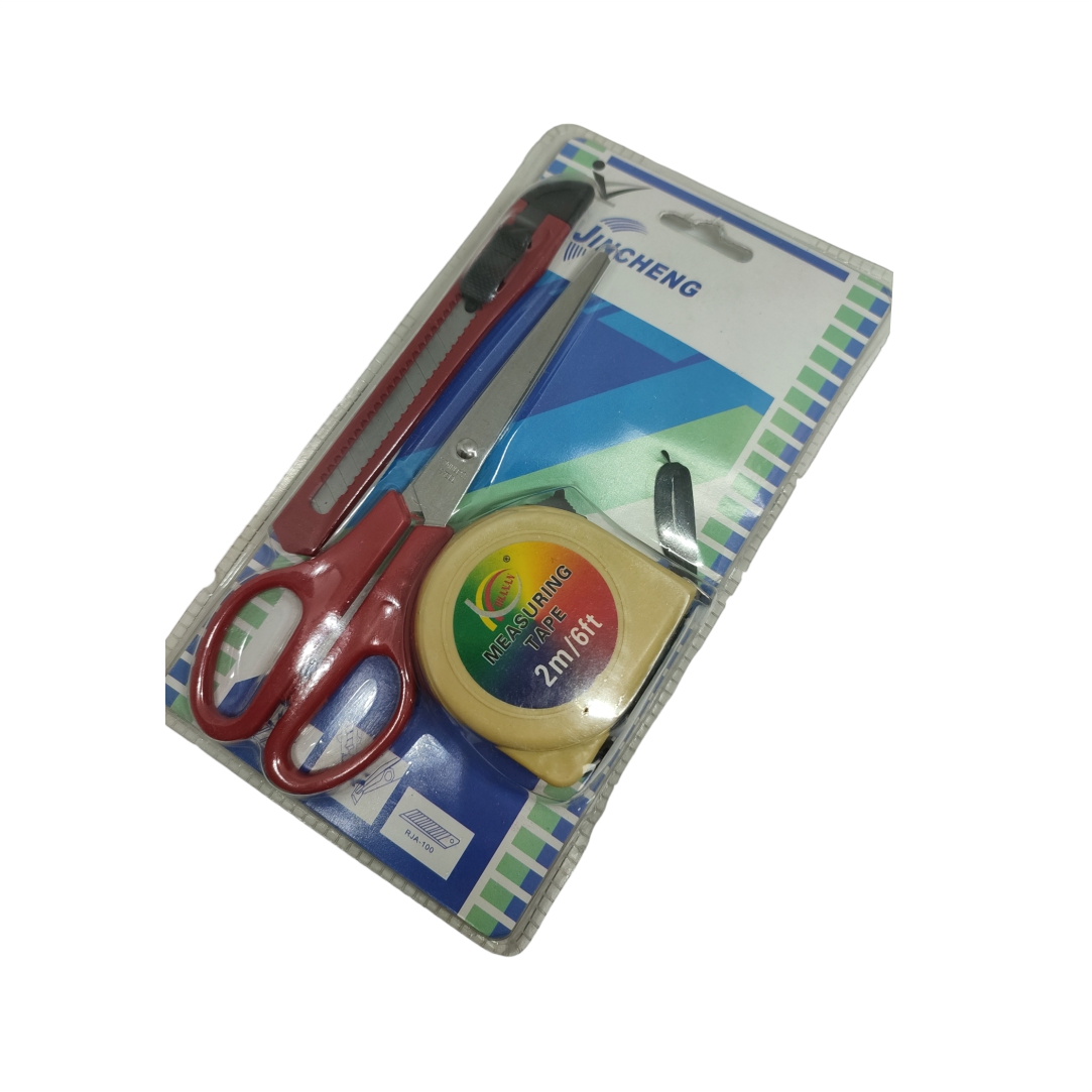 Σετ εργαλείων 3 τεμαχίων. Περιλαμβάνει χαρτοκόπτη, ψαλίδι και μέτρο. Μέτρο 2 μέτρα.