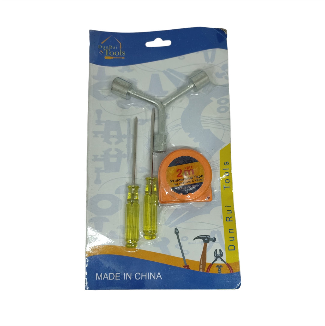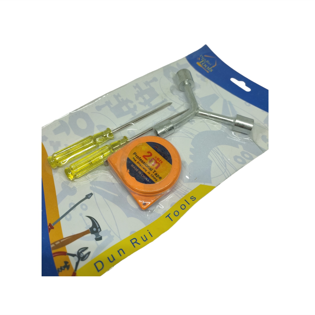 Σετ εργαλείων 4 τεμαχίων. Περιλαμβάνει 2 κατσαβίδια, ένα κλειδί και μέτρο. Μέτρο μήκος 2 μέτρα.