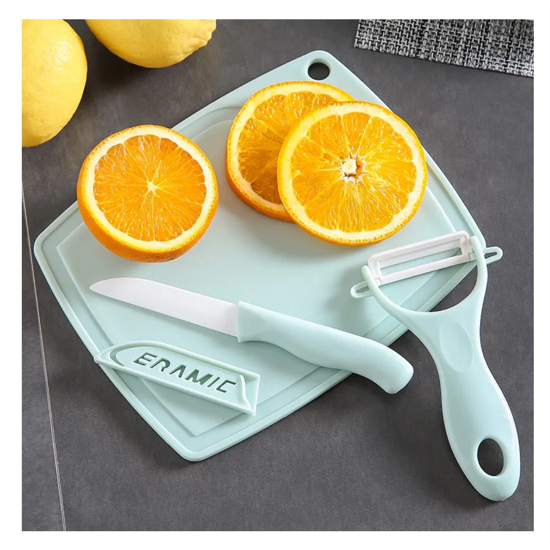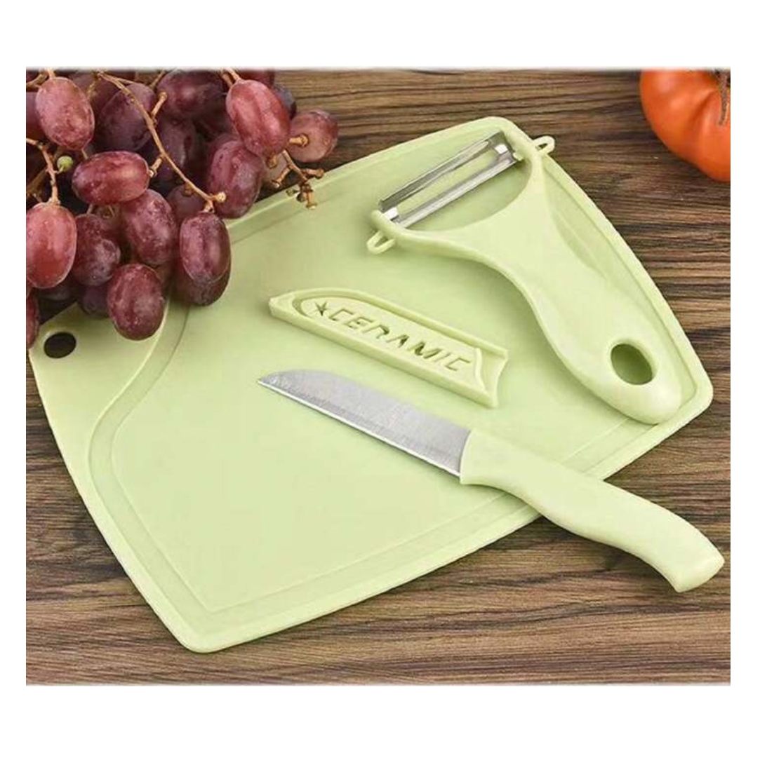 Σετ κοπής κουζίνας. Ιδανικό για να κόβεται εύκολα και γρήγορα τα φρούτα και τα λαχανικά σας. Περιλαμβάνει ένα πάγκο κοπής, αποφλοιωτή και μαχαίρι.