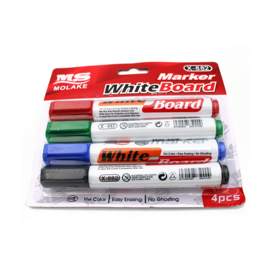 Μαρκαδόροι για ασπροπίνακα. Σβήνει εύκολα χωρίς να αφήνει υπολείμματα. Σταθερή ροή μελανιού και έντονη γραφή. Σετ 4 τεμαχίων πράσινο, κόκκινο, μπλε και μαύρο.